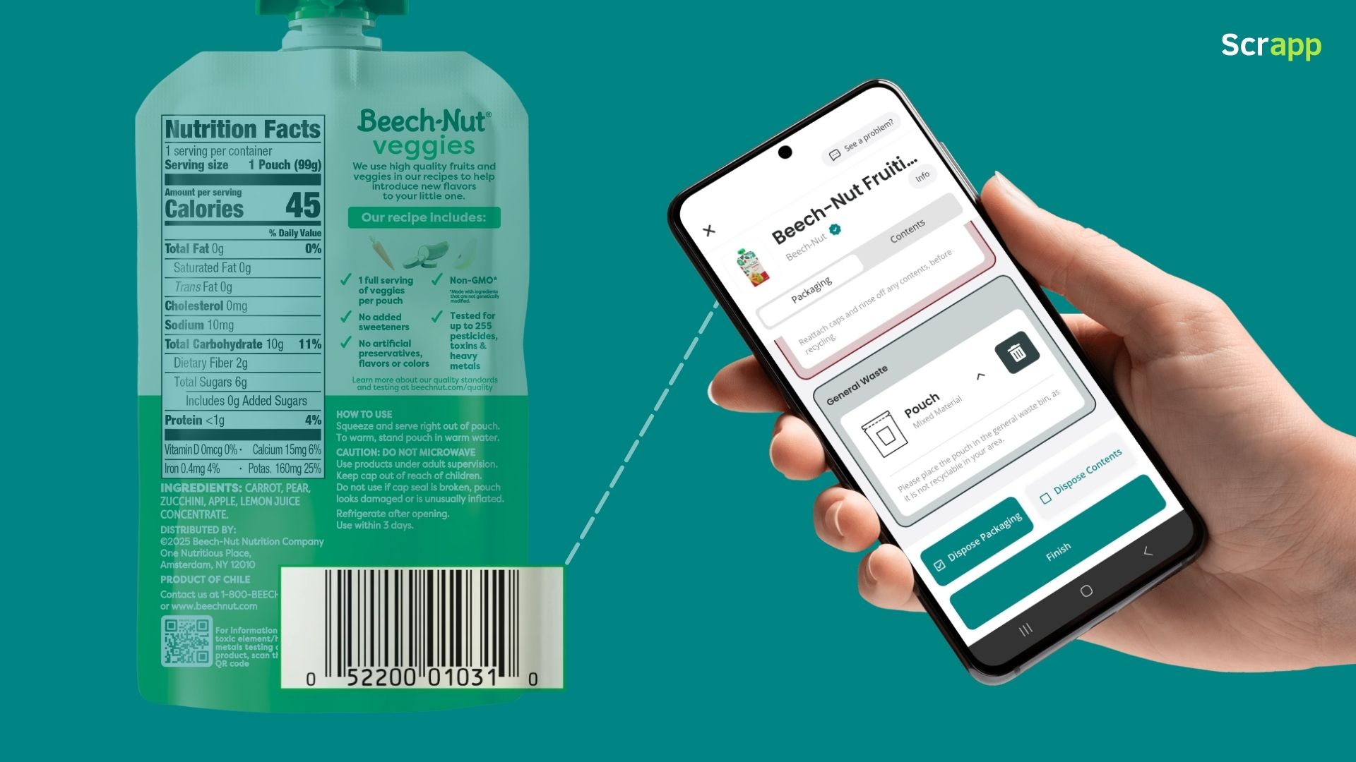 Today, Beech-Nut has their entire product range listed in Scrapp, providing parents with clear disposal instructions tailored to their location. Customer service inquiries about packaging have decreased significantly, while social media engagement around their sustainability efforts has grown. Most importantly, Beech-Nut now communicates confidently about their packaging choices, knowing they're providing parents with the tools to dispose of products responsibly – reinforcing their brand promise of care that extends beyond nutrition.