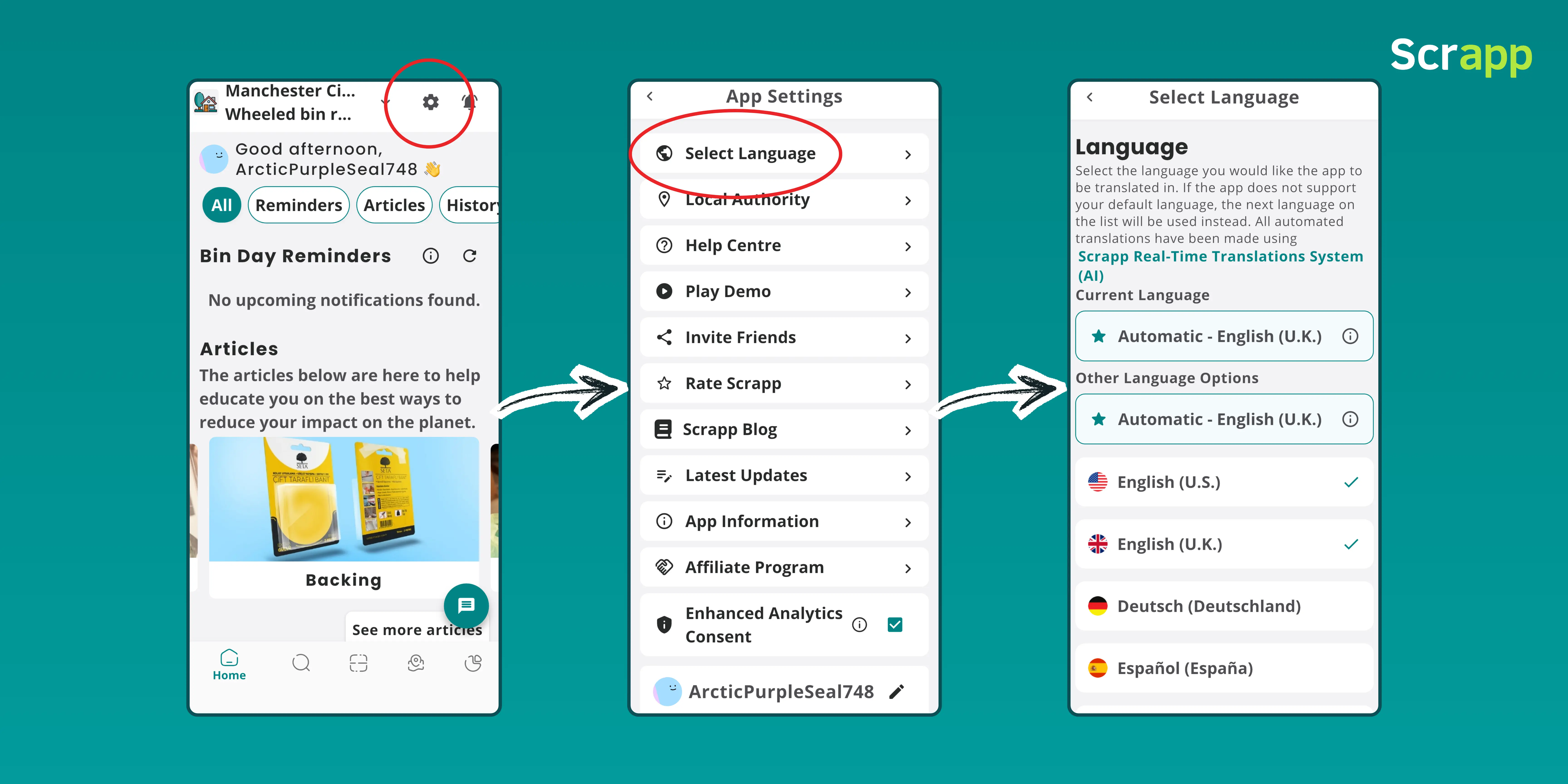 You can change your language manually in the Scrapp mobile app at any time — head to your settings page, select your preferred language from the dropdown, and you're done. The interface updates immediately.
