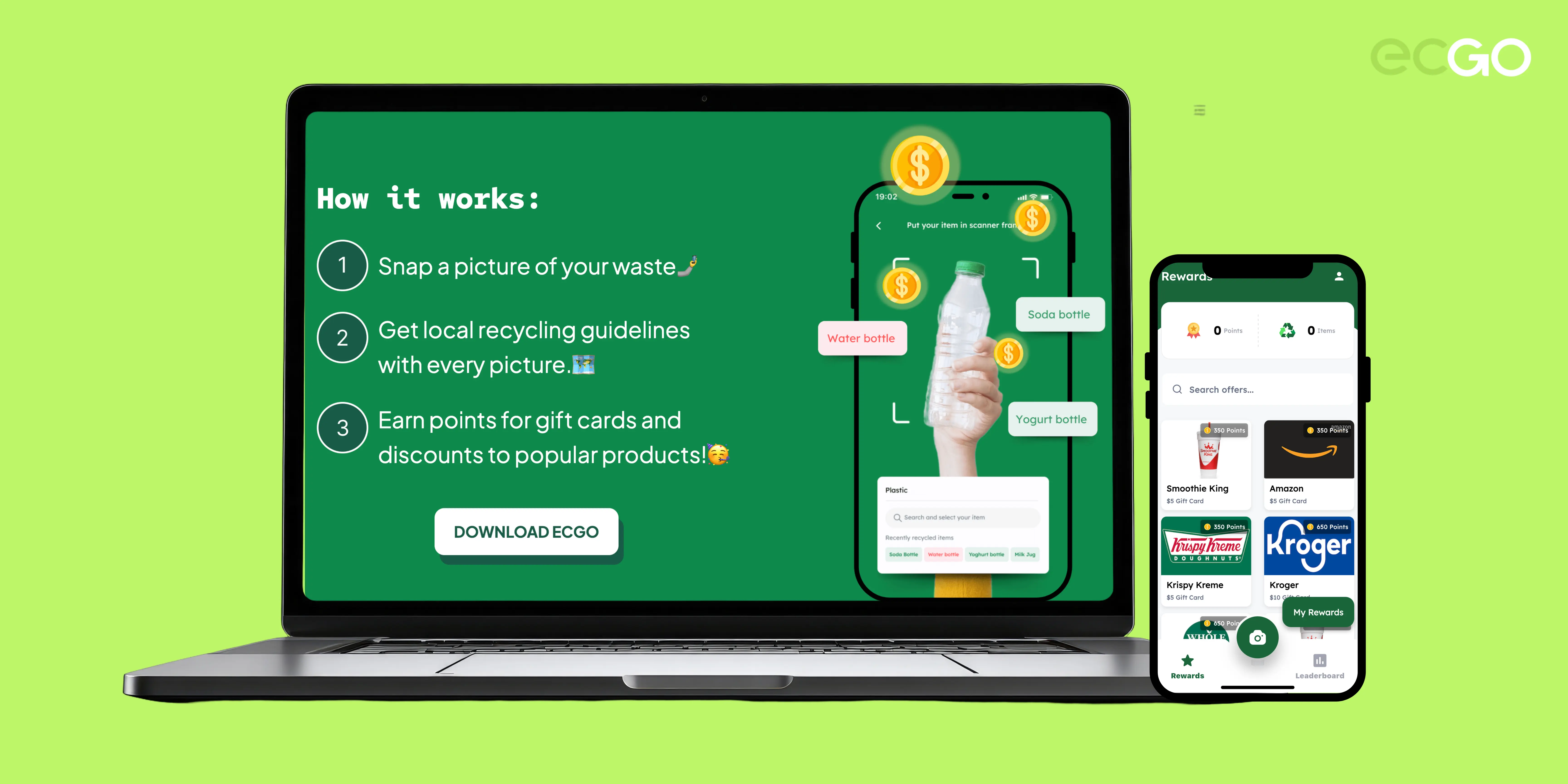 ECGO uses image recognition (snap a photo of any item) to provide location-specific recycling guidelines, paired with a rewards system where points can be redeemed for gift cards from brands like Amazon, Uber, and Publix. The app was purpose-built for universities, with campus-specific waste guidelines and a competitive leaderboard that pits recyclers against one another.