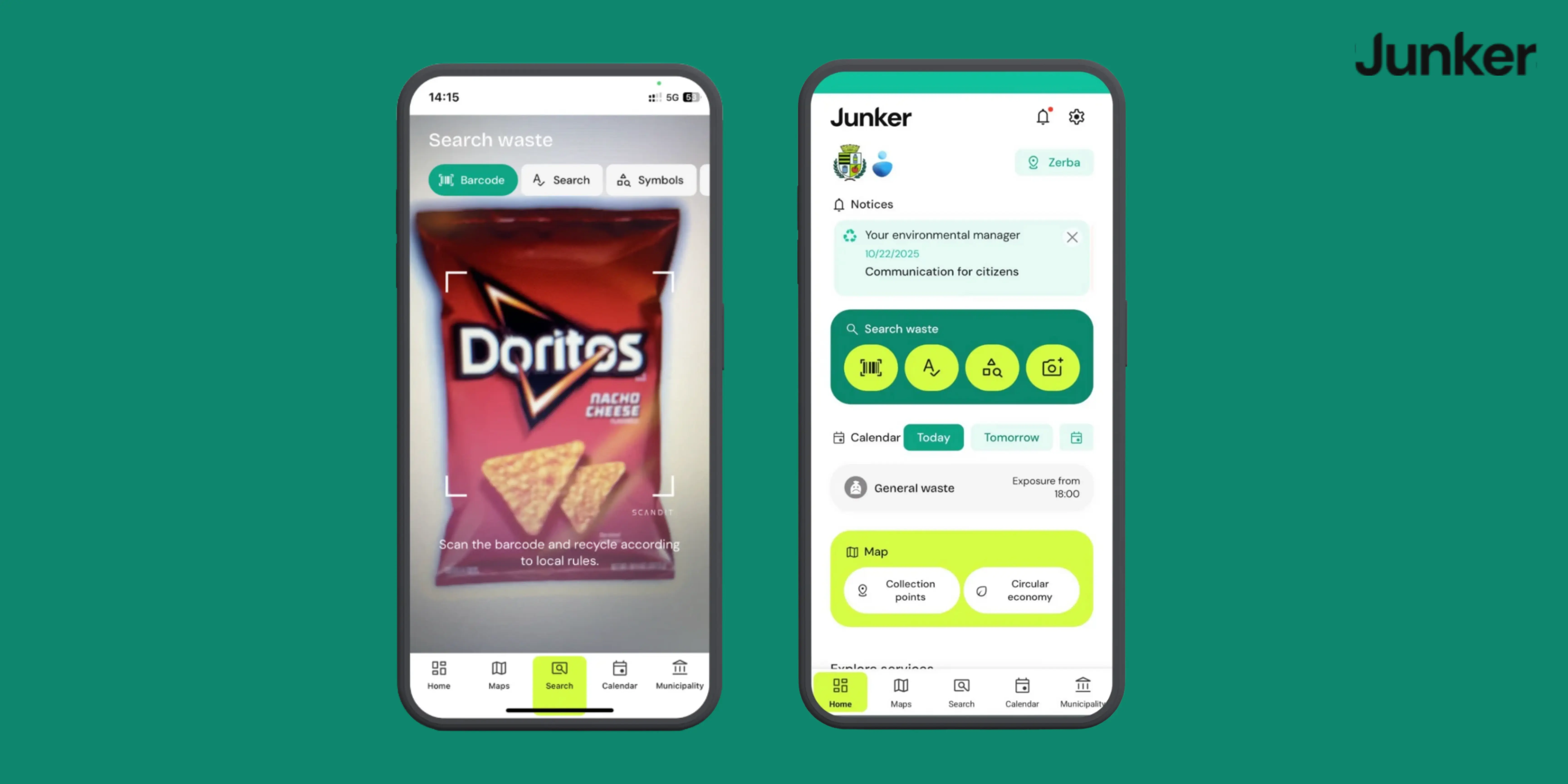Junker is the most established recycling app in the Italian market, serving over 3,500 municipalities and approximately 30 million citizens. It recognizes over 2 million products via barcode scanning, photo recognition, or text search, and provides geolocation-based disposal instructions that update automatically as users travel between municipalities.