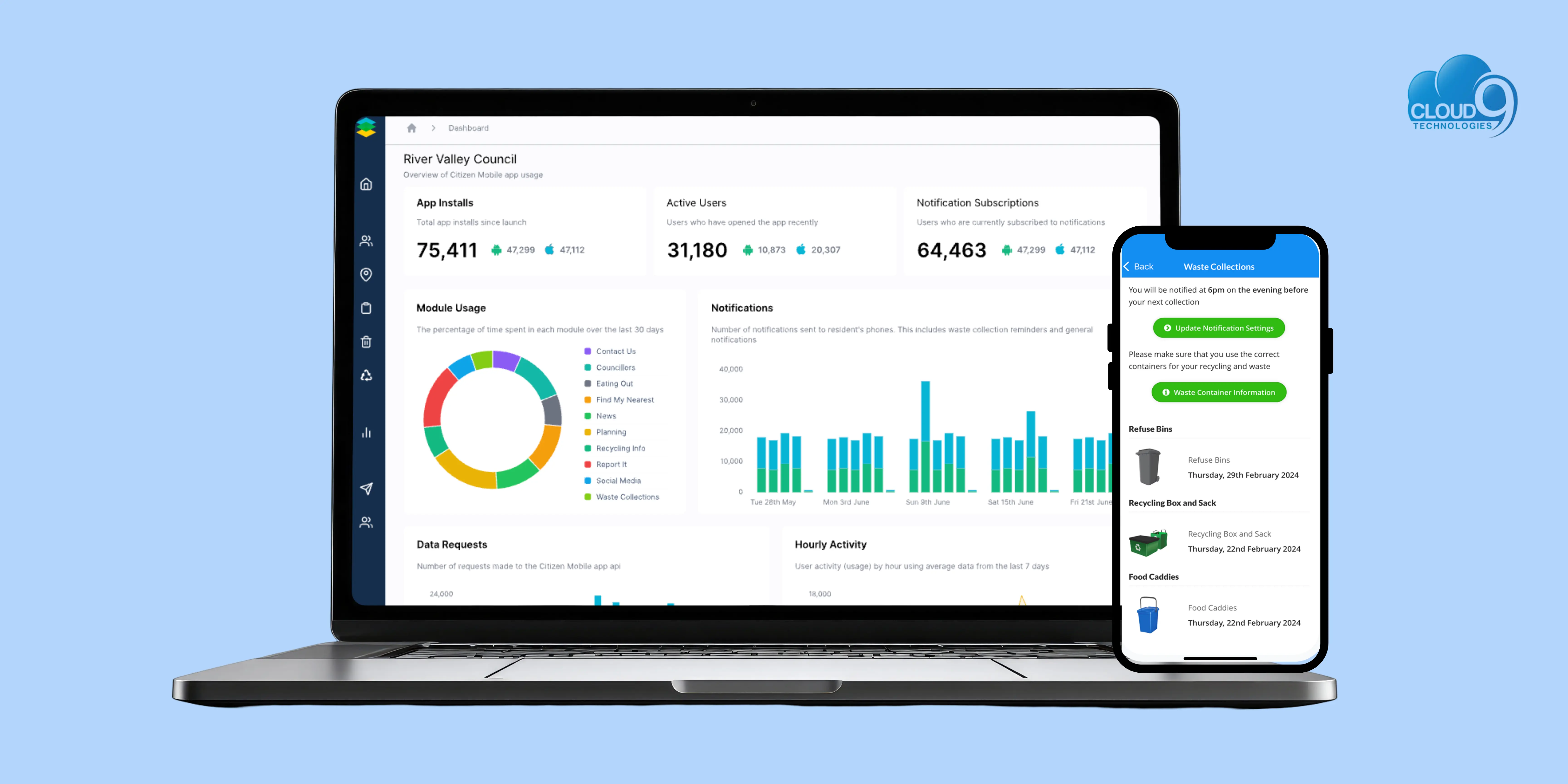 Cloud 9 provides a mobile app platform specifically built for UK local authorities. Their Citizen Mobile App includes bin collection calendars and reminders, searchable recycling information, push notification capabilities, a “Report-It” feature with mobile forms for fly-tipping and missed bins, and a “Find My Nearest” tool for council facilities.